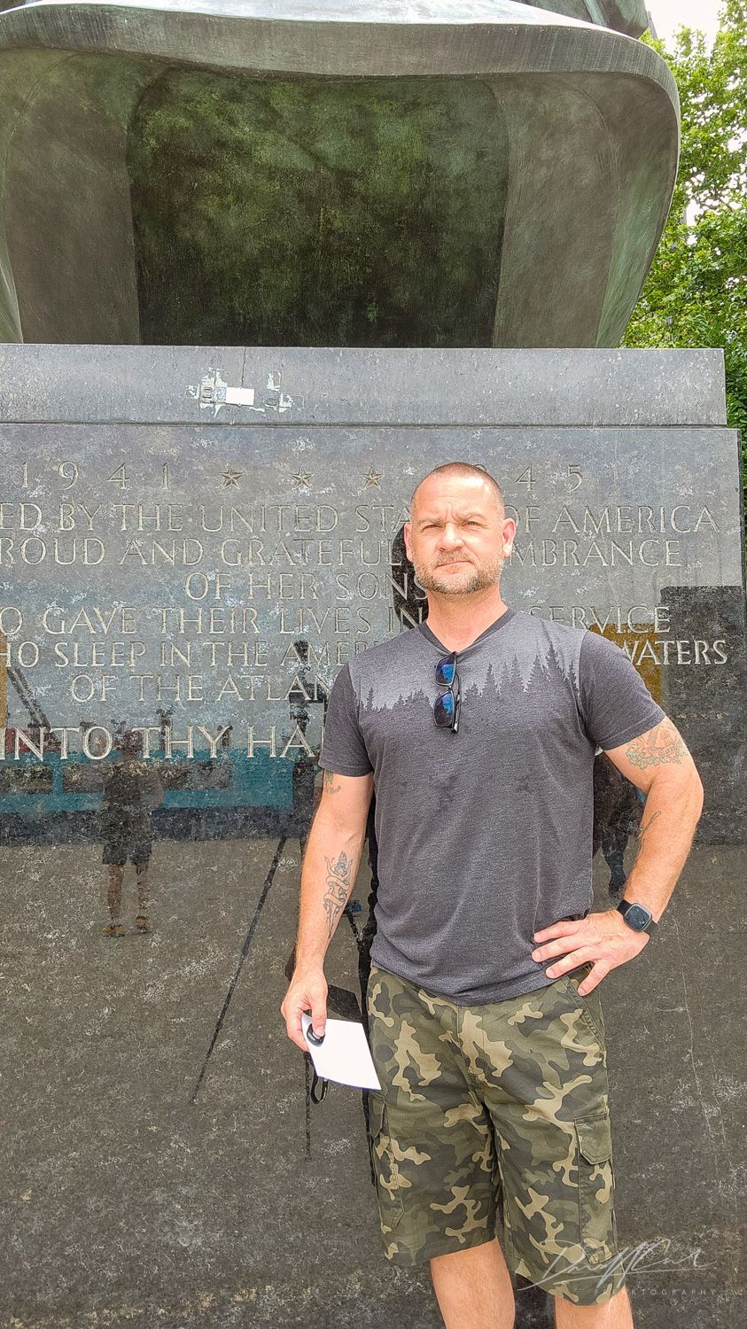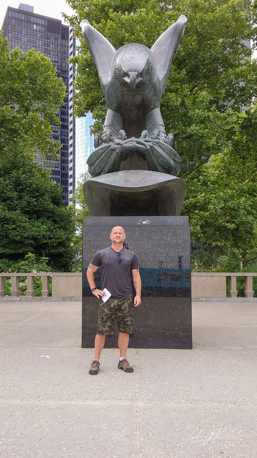 They are standing at a monumental bronze eagle, which grips a laurel wreath over a wave, signifying the act of mourning at the watery grave.